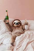 Een vrolijke luiaard zit troont in een gezellig bedlandschap met zachte, neutrale kleuren en belichaamt pure ontspanning met een fles mousserende wijn in de ene hand en een snack in de andere. Zijn ondeugende glimlach en nonchalante houding stralen vrolijkheid en een onweerstaanbare chill vibe uit - perfect voor een ontspannen dag!
