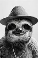 Een zwart-wit portret van een luiaard, gekleed in een hoed en zonnebril, die ongedwongen elegantie uitstraalt. Een perfecte foto die stijl en liefde voor dieren combineert.