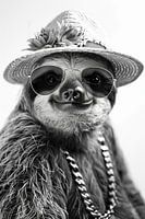 Een zwart-wit portret van een luiaard, gekleed in een hoed en zonnebril, die ongedwongen elegantie uitstraalt. Een perfecte foto die stijl en liefde voor dieren combineert.