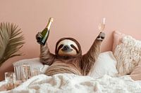 Er staat ons een leuk moment van ontspanning te wachten: een knusse luiaard met een twinkeling in zijn ogen, blij met champagne en een champagneglas in zijn armen. Omringd door donzige kussens en een zachte muurkleur straalt het dier een zorgeloze levensvreugde uit - een echt ontspannen feestgevoel!