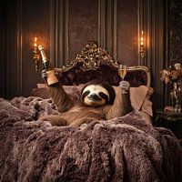 In een luxueuze slaapkamer geniet een innemende luiaardmagnaat met volle teugen van het leven. Met een glas champagne in zijn ene poot en een fles in de andere straalt hij gracieuze tevredenheid uit. Het weelderige beddengoed omlijst dit grillige moment van elegante viering, terwijl zacht kaarslicht een magische sfeer creëert.