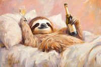 Een volledig ontspannen luiaard geniet met volle teugen van het leven. Met een glas mousserende wijn in de ene hand en een fles champagne in de andere straalt hij pure sereniteit uit. Lekker weggedoken in zachte kussens en omgeven door zachte kleuren, belichaamt hij het perfecte moment van nietsdoen en feestvieren. Een plaatje vol levensvreugde!