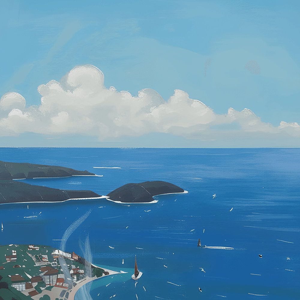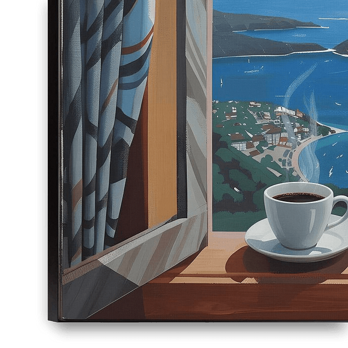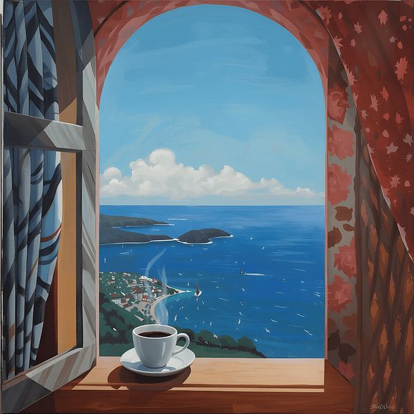 Een rustig moment, zwevend tussen huiselijk comfort en een grenzeloze horizon. Omlijst door gordijnen met patronen en geometrische schaduwen onthult het open raam een zonovergoten kustlandschap: kalm water, eilanden in de verte en zeilen die op de wind meedrijven. Op de voorgrond staat een eenzame kop koffie, waarvan de warmte…