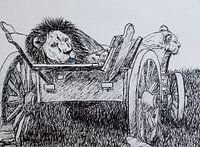 Dit is een pentekening, nagetekend van een eigen foto, van een leeuwenkoppel. Heerlijk aan het luieren op een huifkar.