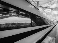 Reflectie van de skyline van Luik in wachtende trein in station Luik Guillemins. Artistiek en fotogeniek spoorwegstation van architect Santiago Calatrava. Zwartwit beeld met mooie lijnen.