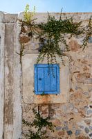 Fotogeniek klein blauw luikje in een oude muur met planten ertegenaan.