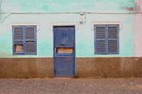 Een vervallen en verlaten huis, bouwval, met verweerd geveltje in pastelkleur. Sal, Kaapverdische Eilanden, Afrika. In het raamkozijn zitten dichtgetimmerde kapotte luiken / shutters (vensterluiken, raamluiken) en Louvre deuren. Urban exploring. Urbex.