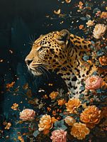 Deze adembenemende afbeelding toont een luipaard, prachtig versmolten met een achtergrond van bloeiende bloemen. De intense vlekken van de luipaard harmoniëren met de rijke tinten van de bloesems in oranje, roze en geel, die levendig afsteken tegen de donkere, diepblauwe achtergrond. Dit kunstwerk ademt een gevoel van stille kracht en natuurlijke schoonheid uit en zou een luxueuze en exotische flair geven aan elke ruimte, van een moderne woonkamer tot een chique slaapkamer.