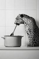 Een majestueuze luipaard die nieuwsgierig in een steelpan kijkt, geeft de keuken een onconventioneel tintje. Met zijn opvallende gevlekte vacht en speelse uitdrukking creëert dit kunstwerk een intrigerende mix van wild en alledaags. Ideaal voor een modern, creatief keukeninterieur dat uitnodigt tot verwonderen en glimlachen.