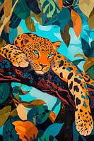 Een majestueuze luipaard troont tussen het weelderige gebladerte, zijn levendige, oranje vacht glanst in contrast met de koele, blauwe tinten van de lucht. Zijn doordringende blauwe ogen glinsteren nieuwsgierig terwijl hij nonchalant over een tak hangt, alsof hij de wereld om zich heen observeert - elegant, krachtig en mysterieus…