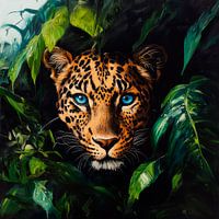 Een fascinerend gezicht glinstert door het dichte groen en trekt meteen de aandacht. De helderblauwe ogen fonkelen achter de bladeren, terwijl de karakteristieke stippen het dier op mysterieuze wijze omringen. Een meesterwerk van de natuur dat kracht en gratie belichaamt, alsof het in het hart van de toeschouwer kijkt.