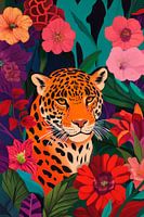 Te midden van de levendige kleuren van tropische bloemen flitst het fascinerende oog van een jaguar op, zijn majestueuze vacht gloeit schitterend oranje op. Dit kunstwerk brengt levendige energie en exotisme in elke kamer en zou een perfecte toevoeging zijn aan de woonkamer om een uitnodigende en inspirerende sfeer te creëren.