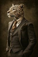 Dit werk toont een elegante luipaard, stijlvol gekleed in een net pak, wat een onverwachte draai geeft aan het klassieke portret. De scherpe lijnen en zorgvuldig gekozen kleuren brengen het speelse contrast tussen het wilde dier en zijn verfijnde kleding tot leven. Dit beeld past perfect in een modern interieur, waarbij het zowel humor als elegantie uitstraalt. De unieke combinatie van het luipaard met de menselijke kleding voegt een vleugje eigenzinnigheid toe aan de ruimte en trekt gegarandeerd de aandacht van de kijker.