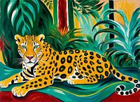 Dit levendige kunstwerk toont een sierlijke luipaard die ontspannen ligt te midden van een weelderig, tropisch landschap. Met zijn felgele vacht en opvallende zwarte vlekken springt de luipaard direct in het oog, omringd door weelderige groene bladeren en rijke rood- en oranjetinten. Het ontwerp heeft een moderne, pop art-achtige…