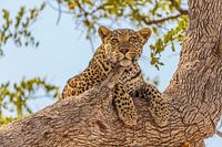 Luipaard (Panthera pardus) hoog in een boom van onderen gefotografeerd. Het dier ligt te sluimeren in de boom in afwachting van zonsondergang. Als het donker is na zonsondergang zal deze katachtige actief worden en gaan jagen.