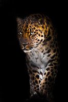 Luipaard met blauwgroene gloeiende ogen komt zelfverzekerd en plotseling tevoorschijn uit de duisternis van de nacht, portret met poten, zwarte achtergrond
