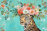 Een majestueuze luipaard tooit zich met een weelderige krans van kleurrijke bloemen, terwijl zijn krachtige blik vol gratie en mysterie is. De harmonieuze combinatie van jungle-achtige elementen en bloemenaccenten geeft dit kunstwerk een levendige frisheid. Ideaal voor een woonkamer, waar het een gespreksonderwerp wordt en een vleugje elegantie uitstraalt.
