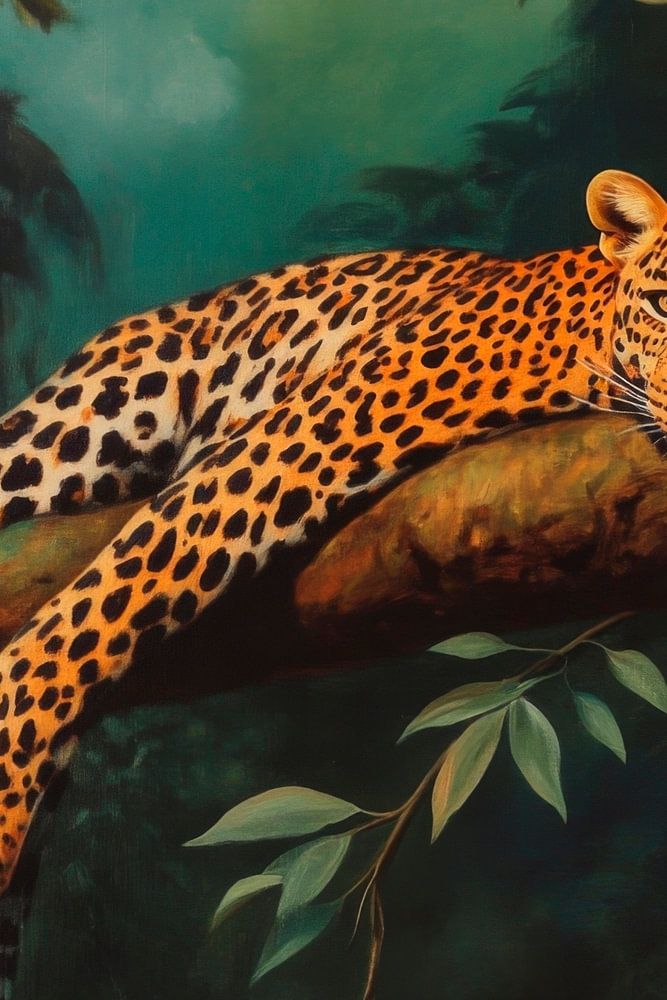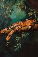 In het dichte groen van de jungle zit een luipaard majestueus op een tak, zijn lenige lichaam nonchalant uitgestrekt. De felle, pokdalige kleuren van zijn vachtpatroon vormen een indrukwekkend contrast met de zachte omhelzing van de bladeren. De wildheid van de natuur glinstert in zijn kalme elegantie, terwijl een mysterieuze glinstering in zijn ogen avontuur belooft.