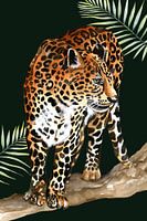 Luipaard op tak en tropische blad gemaakt in aquarel en digitaal bewerkt. Ook leuk als set zie de 2 andere luipaardschilderijen.