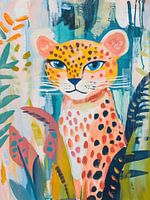Details: Luipaard, dieren schilderij, tuin schilderij, kleurrijk, bladeren, vrolijk, blauw, groen, geel, oranje