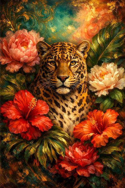 In De Waker van het Tropisch Paradijs ontmoet de kracht van de luipaar in de natuur en haar eigen elegantie. In dit werk staat een majestueuze luipaard centraal, omringd door weelderige bloemen in warme tinten rood, oranje en zachtroze. De diepte van zijn amberkleurige ogen weerspiegelt een serene waakzaamheid een stille beschermer te…