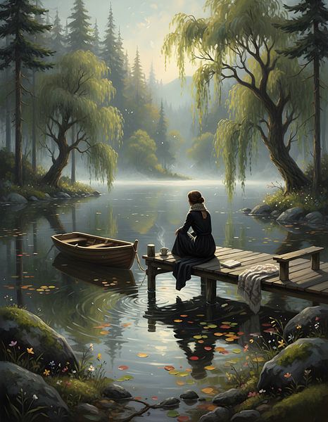 Dit rustgevende tafereel toont een eenzame vrouw die op een houten steiger aan een mistig meer zit, omringd door een dicht bos. De vrouw, gekleed in donkere kleding, staart uit over het kalme water, waarin het zachte licht dat door de bomen schijnt, weerspiegelt. Vlakbij ligt een kleine houten roeiboot aan de steiger vastgebonden.…
