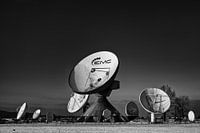 Het grondstation in Raisting, Beieren, Duitsland. Zwart-wit.
