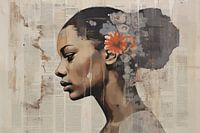 Luna Portret - abstract schilderij / mixed media kunst geschilderd. Mooi contrast tussen het verfijnde portret en rauwe collage/schildertechniek.