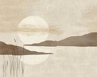 Lunar Silence - Dit minimalistische landschapsschilderij toont een serene afbeelding van een berglandschap onder een grote, volle maan. Het schilderij bestaat uit verschillende lagen met een ondergaande zon op de achtergrond die zorgt voor een zachte, subtiele gloed die het hele tafereel verlicht. De bergen, uitgestrekt en in tinten van lichtbruin tot donkerbruin, verdelen het canvas horizontaal op een kalme en rustgevende manier. Op de voorgrond is een meer te zien, glad en ongestoord, dat de lucht en de bergen weerspiegelt en zorgt voor een dieptewerking in het schilderij. In de onderste rechterhoek zijn slanke, zwarte grassprieten te zien die omhoog steken tegen de lichte achtergrond, wat een mooi contrast oplevert met de overwegend zachte kleuren van het doek.