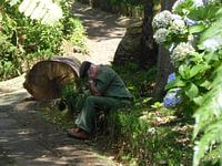 Een tuinman met lunchpauze in de Botanische tuin van Madeira. Dit is één van de manieren om pauze te houden in de hitte van Madeira. Heerlijk in de schaduw van een boom tussen de Hortensia`s.