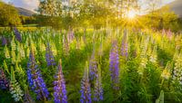 Op een mooie zomerdag vallen de laatste zonnestralen op een veld met bloeiende lupines in Noorwegen. Een kleurrijke en weelderige landschapsfoto.