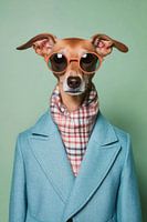 Met een stijlvolle jas en trendy zonnebril straalt deze Lurcher elegantie en coolheid uit. Zijn zachte, amandelvormige ogen schitteren achter de bril, terwijl de nonchalante sjaal een vleugje gezelligheid toevoegt. Een echte fashionista op vier poten, klaar om elke catwalk te veroveren!