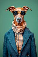 Een elegante Lurcher, die een stijlvolle jas en een modieuze zonnebril draagt, belichaamt charme en persoonlijkheid. Zijn zelfverzekerde look en nonchalante sjaalstropdas geven hem een speciale uitstraling. Een echte fijnproever van stijl die tijdloze chic combineert met een vleugje speelsheid. Gewoonweg onweerstaanbaar!