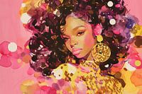 Lush Blooms in Motion - Dit vrouwen schilderij toont een portret van een vrouw met een expressieve blik en volumineus, gestileerd haar dat lijkt te fuseren met abstracte elementen, in een kleurenpalet van voornamelijk roze en geel.