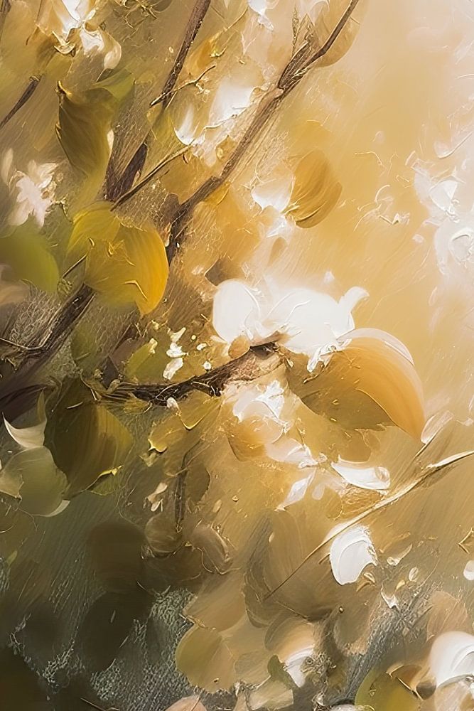Lush Eden is een dromerig kunstwerk in Mixed Media dat een moment van rust in de natuur vangt. In zachte tinten en met delicate penseelstreken toont het werk een bloeiende appelboom, gehuld in een nevelige gloed van licht. Zachtgeel fruit hangt tussen de bladeren, terwijl diffuus zonlicht door het gebladerte filtert en een warme, bijna etherische sfeer creëert. De subtiele gouden accenten versterken het gevoel van zachtheid en verwondering, en nodigen de toeschouwer uit tot contemplatie en verbinding met de schoonheid van het alledaagse buitenleven.
