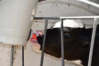 Het lieve kalfje van een boerderij dronk melk van zijn/haar moeder uit een emmer met daaraan een tuitje die op een uier leek. Zo lief om te zien, ik mocht toekijken hoe het kalf guitig de melk dronk.