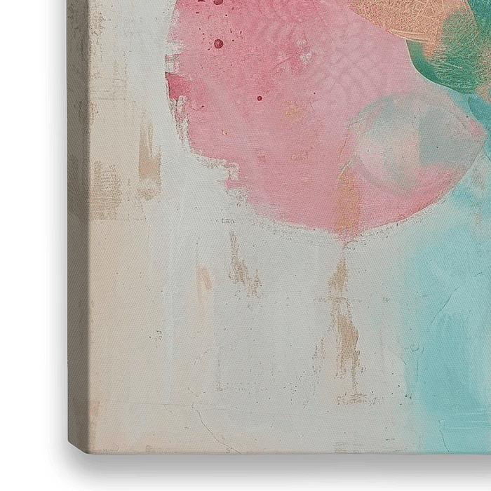 Dit abstracte schilderij kenmerkt zich door een zachte, dromerige sfeer met gelaagde, vloeiende penseelstreken. De compositie bevat organische, ronde vormen en delicate bladvormen. Expressief abstract schilderij in roze, aquamarijn en goud. Organische vormen en luxe accenten. Perfecte moderne wanddecoratie voor Woonkamer of…