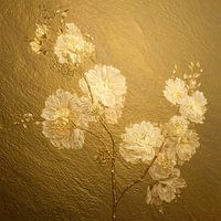 Dit luxe Mixed media kunstwerk combineert een opvallende goudkleurige achtergrond met een delicate champagnekleurige bloemen.