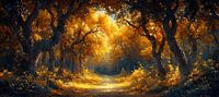 Luxe Landschapskunst - Dit landschapsschilderij verbeeldt een weelderig, gouden bos wat een zacht en verstillend gevoel opwekt, perfect weergegeven door de overvloed aan warme gele en oranje tinten.