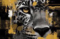 Dit krachtige portret van een luipaard vangt een moment van intense focus en stille dominantie. De doordringende gouden oogopslag contrasteert sterk met de diepe zwarttinten en het gedetailleerde vachtpatroon. Abstracte structuren en verfachtige accenten in goud en grijs geven het werk een luxueuze, bijna industriële uitstraling. Het…