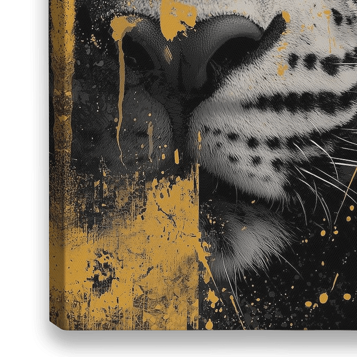 Dit krachtige portret van een luipaard vangt een moment van intense focus en stille dominantie. De doordringende gouden oogopslag contrasteert sterk met de diepe zwarttinten en het gedetailleerde vachtpatroon. Abstracte structuren en verfachtige accenten in goud en grijs geven het werk een luxueuze, bijna industriële uitstraling. Het…
