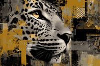 Dit krachtige portret van een luipaard vangt een moment van intense focus en stille dominantie. De doordringende gouden oogopslag contrasteert sterk met de diepe zwarttinten en het gedetailleerde vachtpatroon. Abstracte structuren en verfachtige accenten in goud en grijs geven het werk een luxueuze, bijna industriële uitstraling. Het…