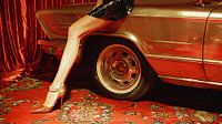 Het beeld toont de slanke benen van een vrouw, stijlvol gekleed in een korte, glinsterende zwarte jurk en gouden hoge hakken met een verfijnd enkelbandje. De achtergrond wordt gedomineerd door een glanzende gouden auto, waarvan de reflecterende oppervlakken de rijkdom van de scène benadrukken. Het rode tapijt en de fluwelen gordijnen voegen een warme, theatrale sfeer toe, waardoor het beeld aanvoelt als een moment uit een luxueuze, tijdloze wereld. Dit kunstwerk benadrukt het samenspel van contrasten: kracht en zachtheid, technologie en schoonheid, traditie en glamour.