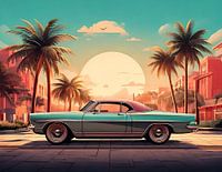 Collector's auto in het stedelijke landschap van een zuidelijke stad zoals Cuba. De vintage kleuren en graphics van de afbeelding passen bijzonder goed bij de stijl van het voertuig en de tropische vegetatie die wordt vertegenwoordigd door de palmbomen. Een opkomende zon geeft het geheel een warme, gastvrije uitstraling.