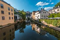 Tags: Luxemburg, Oude Stad, Alzette, Rivier, Brug Grund, Rue Munster, Stadsgezicht, Reflecties.