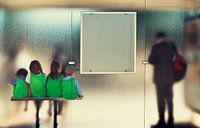 4 Kinderen gekleed in groen op een bankje wachtend op de bus, gefotografeerd in Luxemburg stad vanuit de auto.