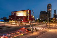 Het Luxor Theater in Rotterdam (Zuid-Holland, Nederland). Een schitterend punt voor avondfotografie, zeker als de omstandigheden prima zijn! De kleuren spatten er vanaf, zeker ten opzichte van de egaal blauwe lucht. Heerlijke plek voor cityscapes!