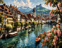 Een serene rivier stroomt door een oud Europees stadje, geflankeerd door traditionele gebouwen en bloeiende bloemen. Op de achtergrond rijzen majestueuze bergen op onder een helderblauwe hemel, terwijl boten zachtjes aanmeren langs de rand van de rivier.