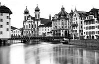 Zwartwit opname van Luzern met de jezuïeten kerk op de achtergrond.