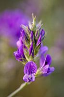 Een blauw-paarse Luzerne plant in een bloemstrook langs een akker tussen Mechelen en Wittem (Zuid-Limburg, Nederland).